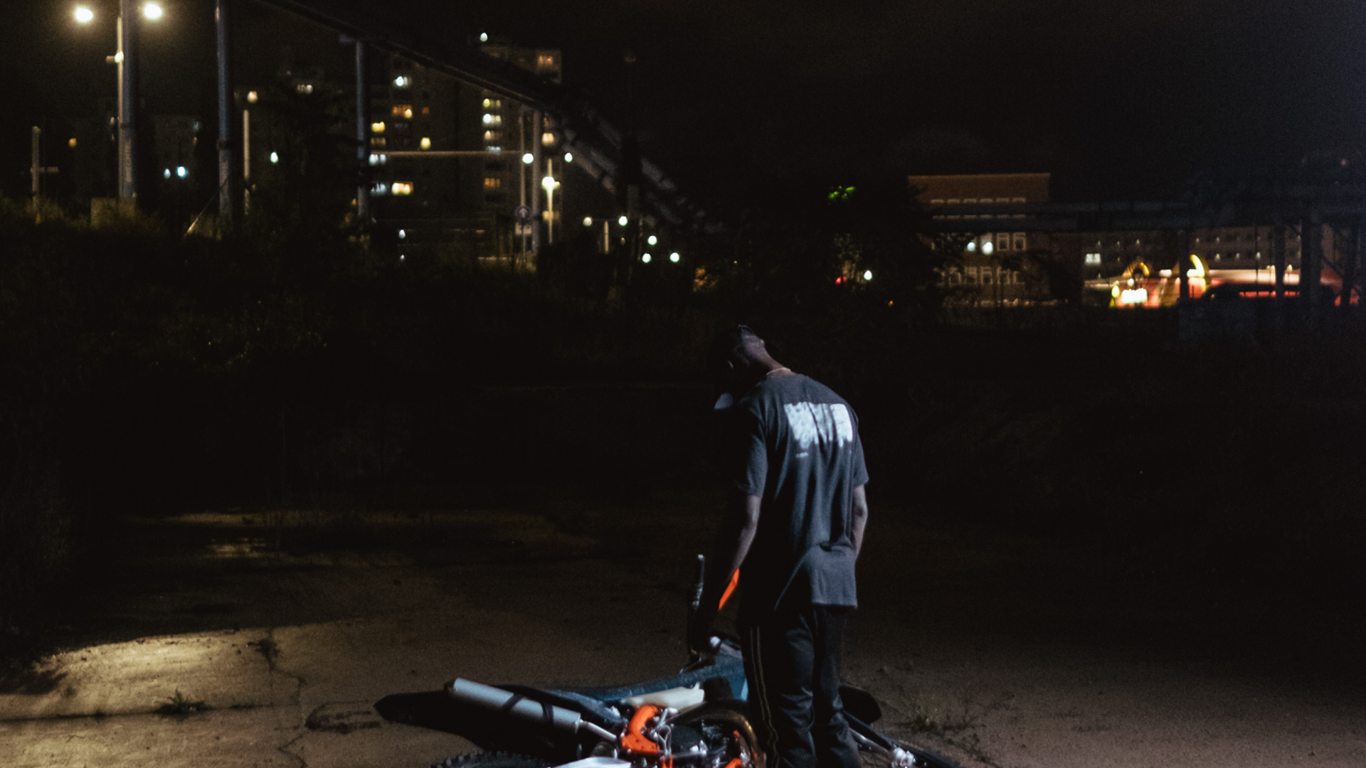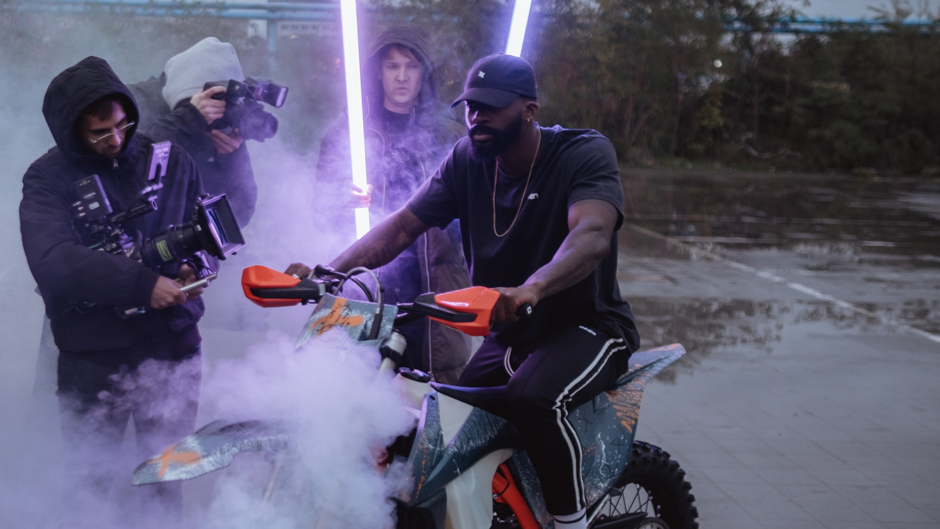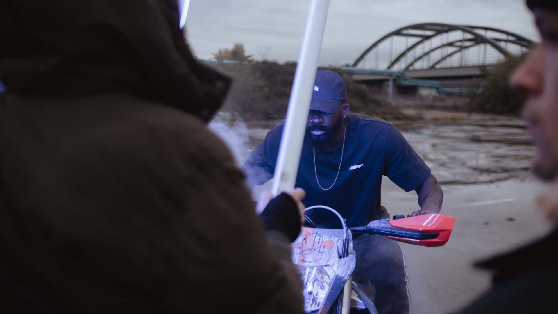 Durchdrehende Reifen, fliegender Dreck, Rauch und der Duft nach verbranntem Gummi. Die Filmcrew tummelt sich auf einem verlassenen Parkplatz. Kenny posiert auf der Maschine, ausgestattet mit dem ,,customized decor'' von Hoker One ( siehe Ripin x Hoker One).